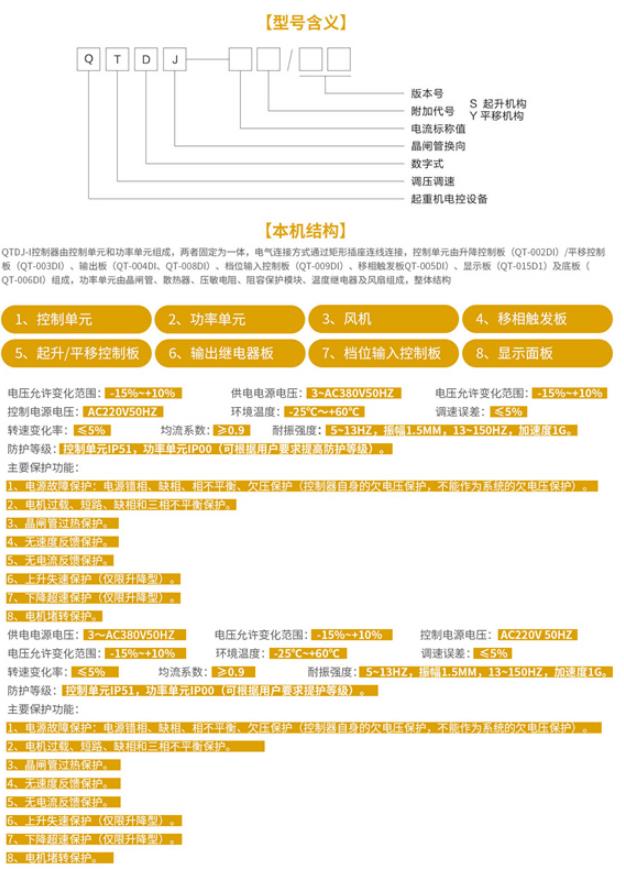 QTDJ-I型交流绕线电机调压调速控制器是根据起重机运行特点而开发的专业调速产品,该产品在QTDJ控制器的基础上开发,属我公司第二代调速产品,具有完全独立的自主知识产权。新一代的QTDJ-I控制器采用了先进的软硬件技术,主要技术指标达到国际先进水平。主令信号(220V)直接输入,控制器内部光电转换,输出以内部晶闸管换向代替外部接触器换向。这二项改进不仅简化外部电路设计,而且提高了系统应用的可靠性。QTDJ-I控制器与前一代产品相比,控制性能更为优越,而且降低了系统应用的造价,特别适合用于重级工作制且处于恶劣环境中的起重机的驱动和控制。